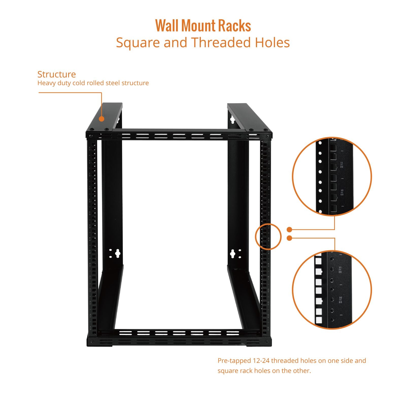 Widely Applicable: Open Frame Rack with both 12-24 threaded holes and square holes; Available in 6U/9U/12U/15U and 15.8-inch/24.8-inch depth.