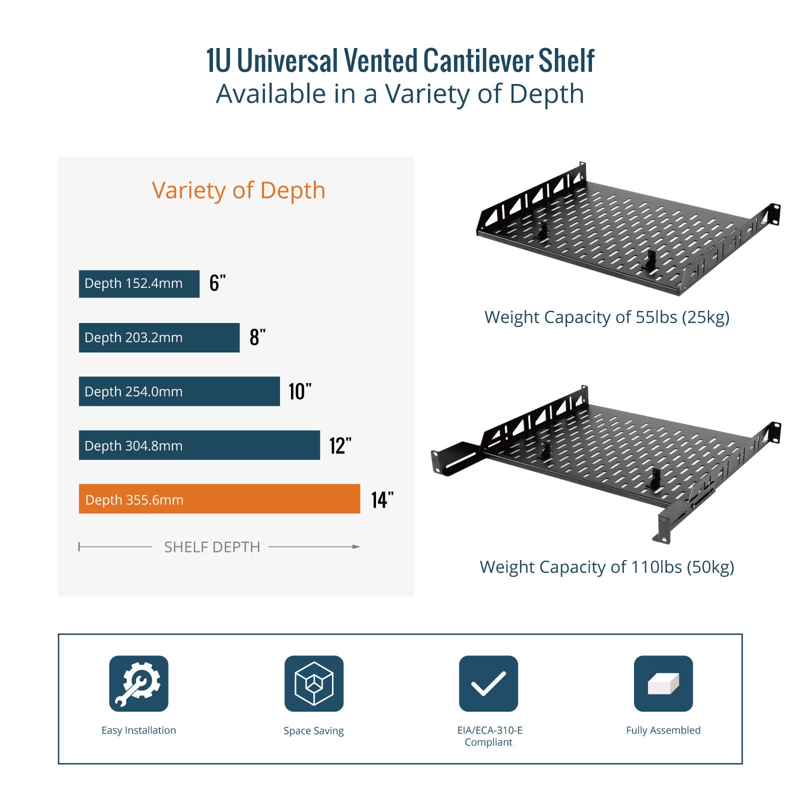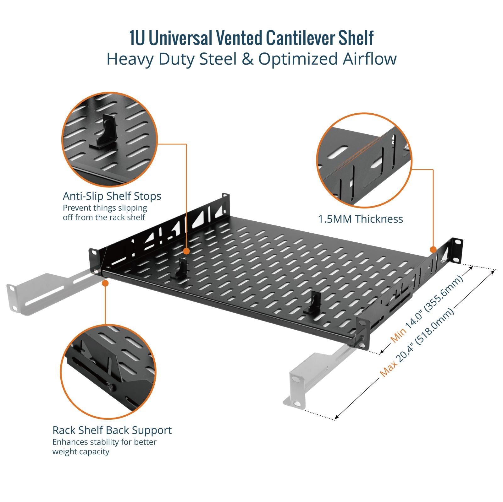 Tecmojo 1U 14 inch Depth Rack Shelf with Anti-Slip Stops for 19 inch Equipment-110lbs Weight Capacity(2 Pack)