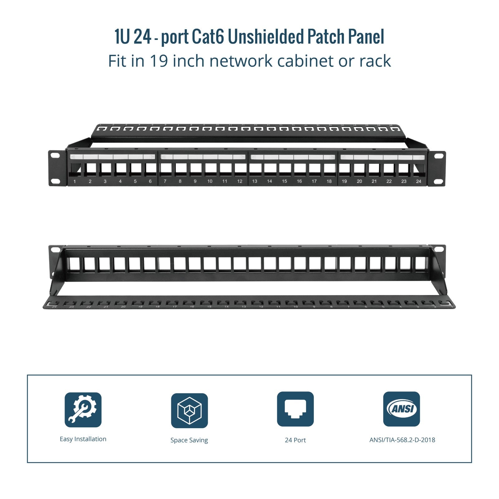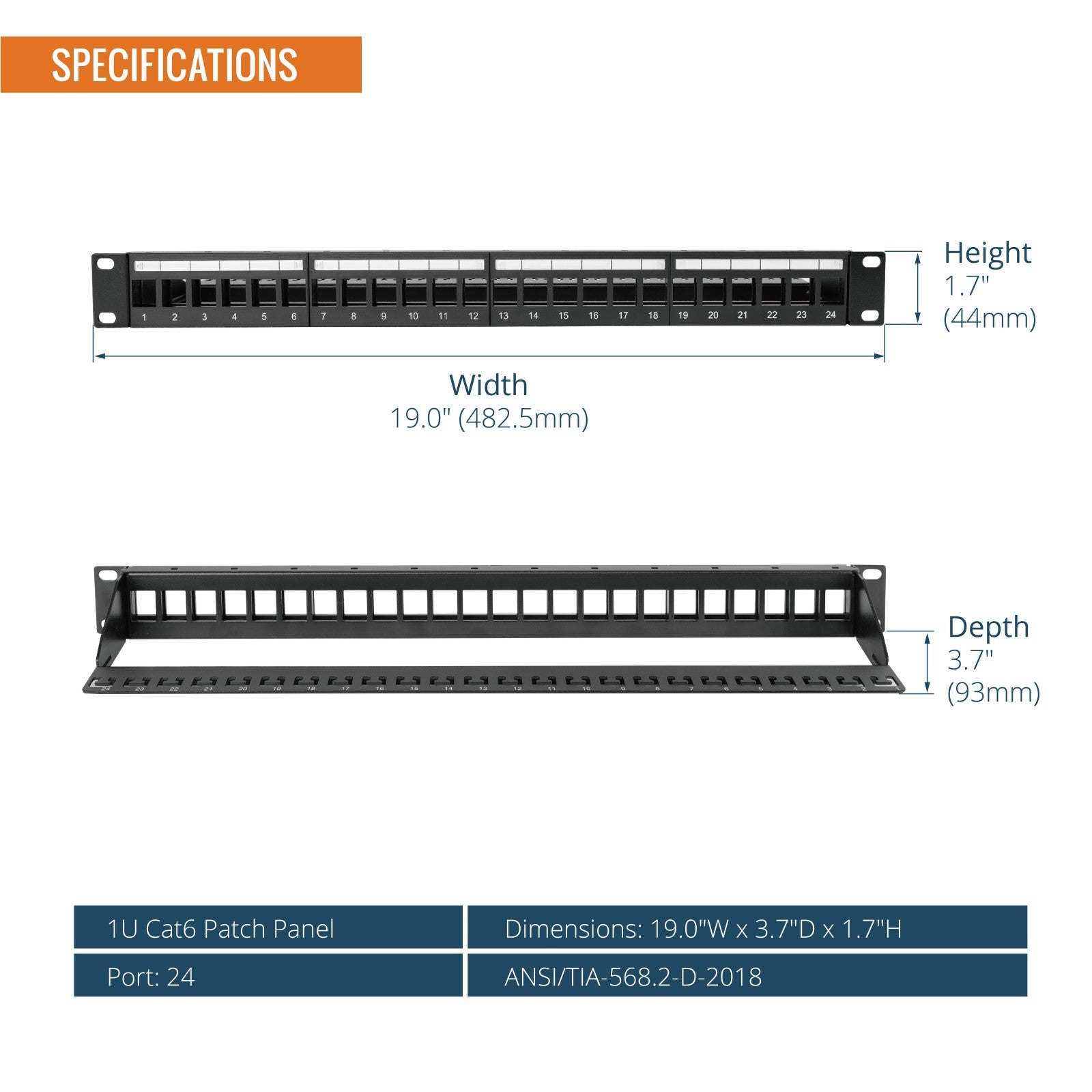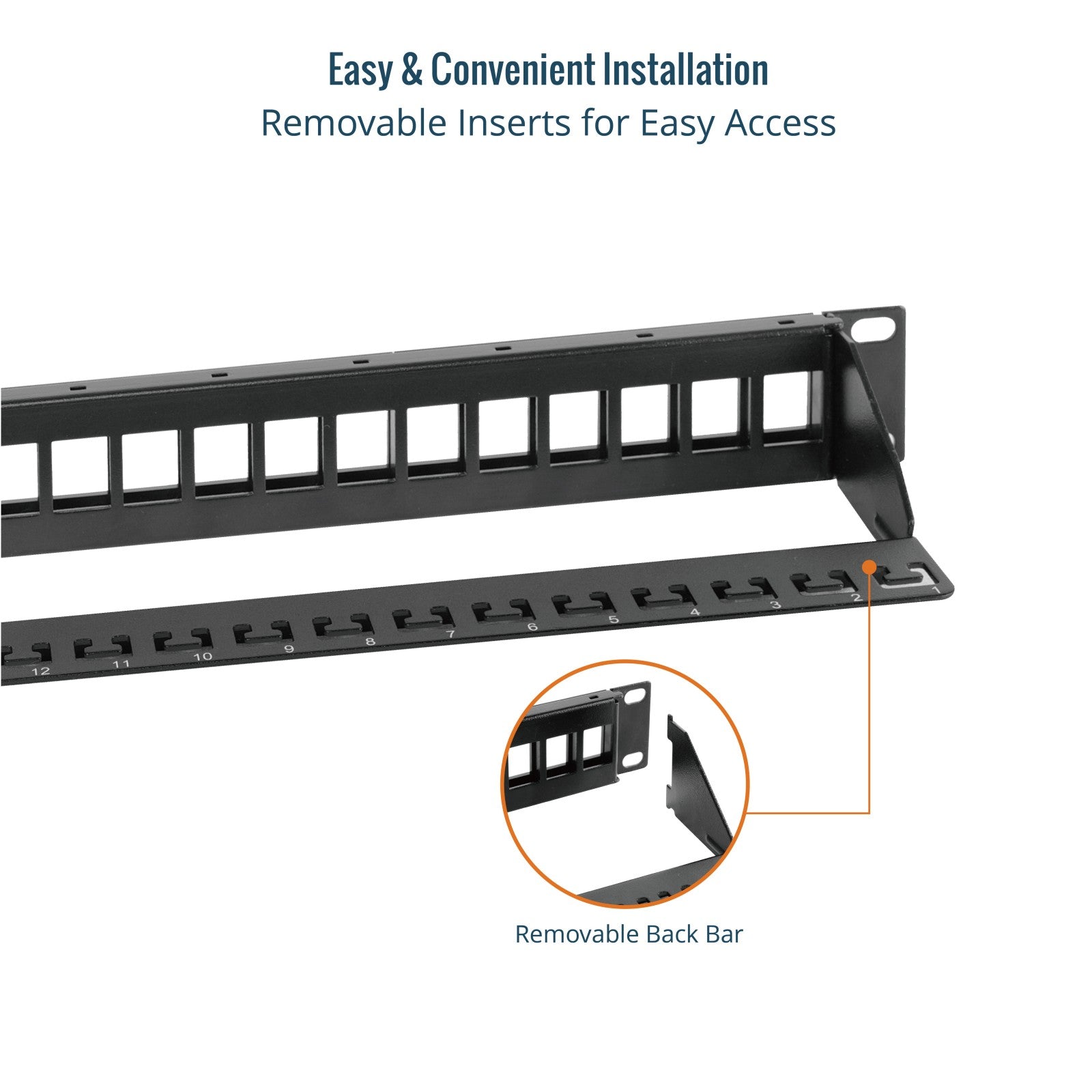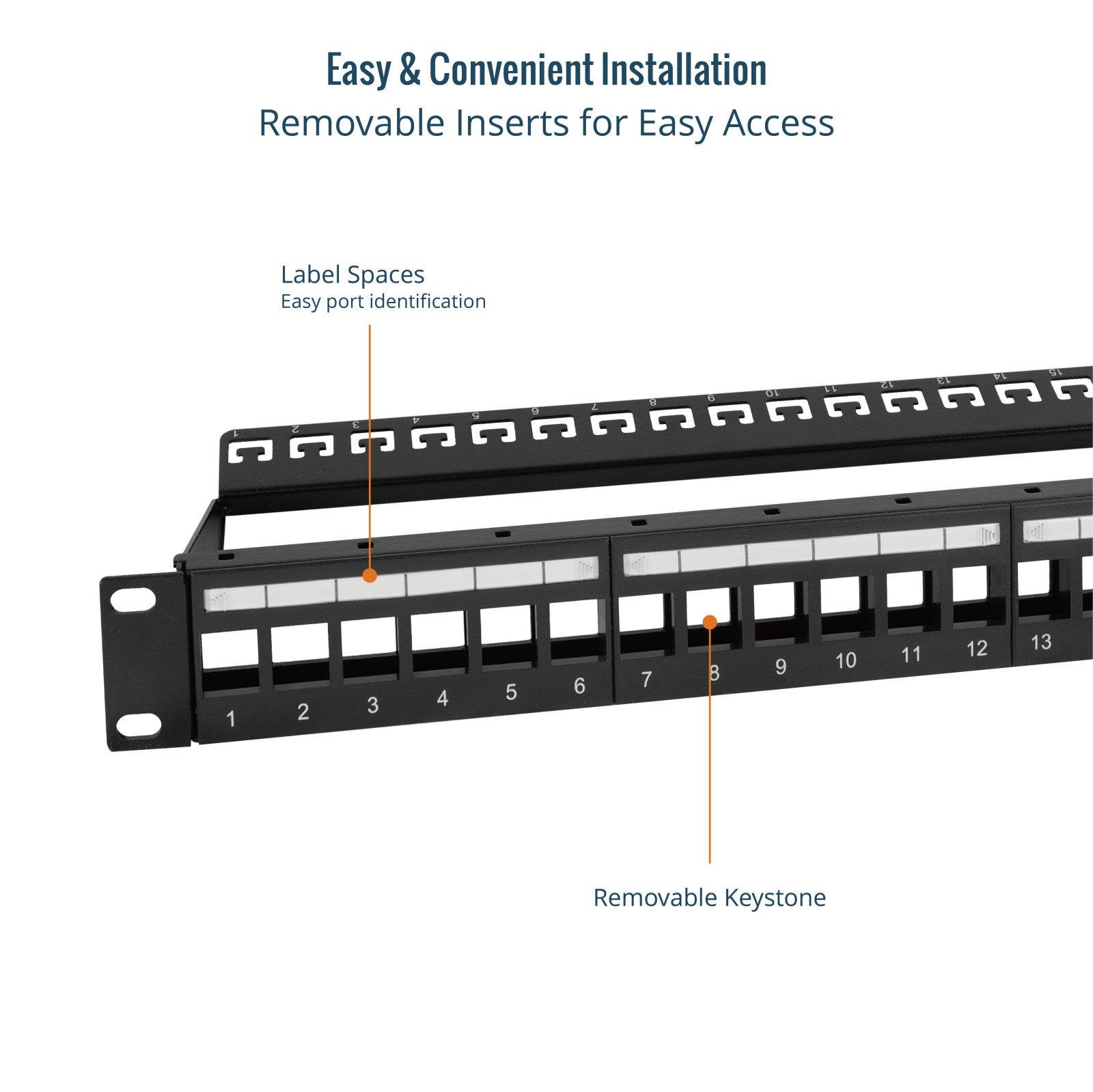 Tecmojo 1U 24-Port Blank Patch Panel with Cable Management Support Bar for Keystone Jacks/Keystone Panel