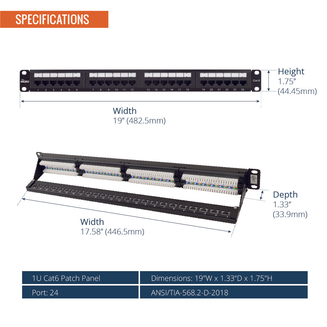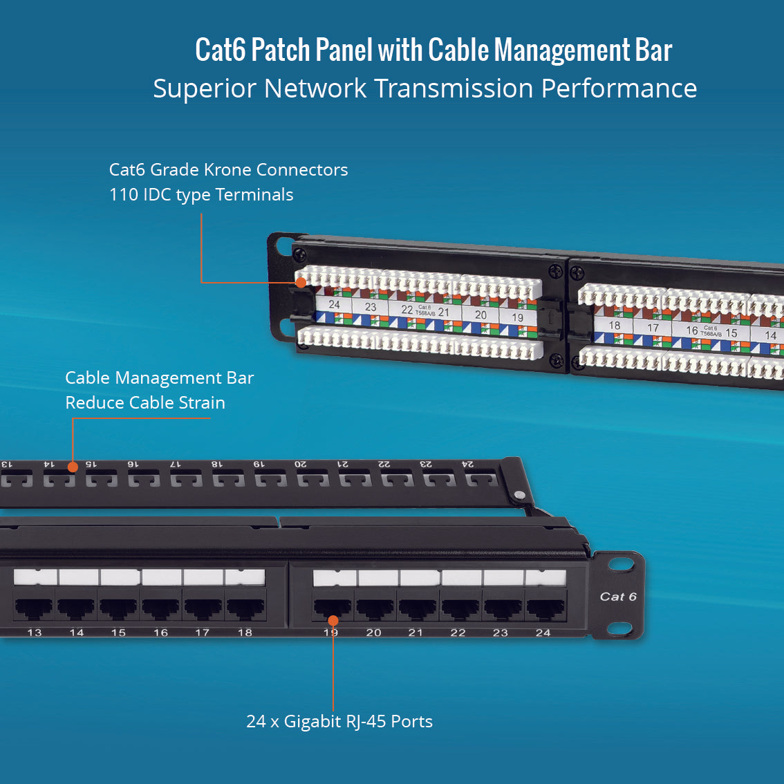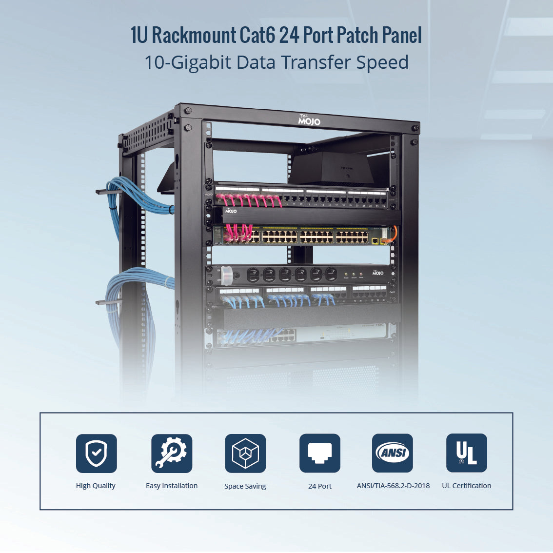 Tecmojo 1U 24-Port Cat6 Patch Panel with Cable Management for 19 inch Equipment