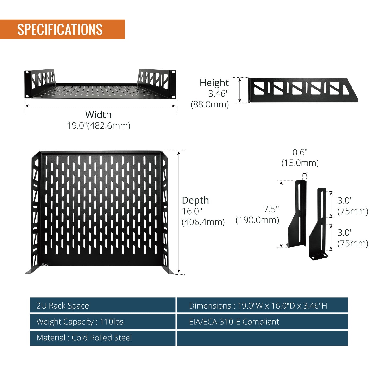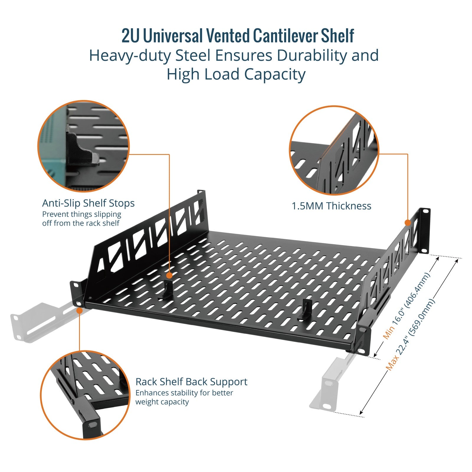 Tecmojo 2U 16 inch Depth Rack Shelf with Anti-Slip Stops for 19 inch Equipment-110lbs Weight Capacity