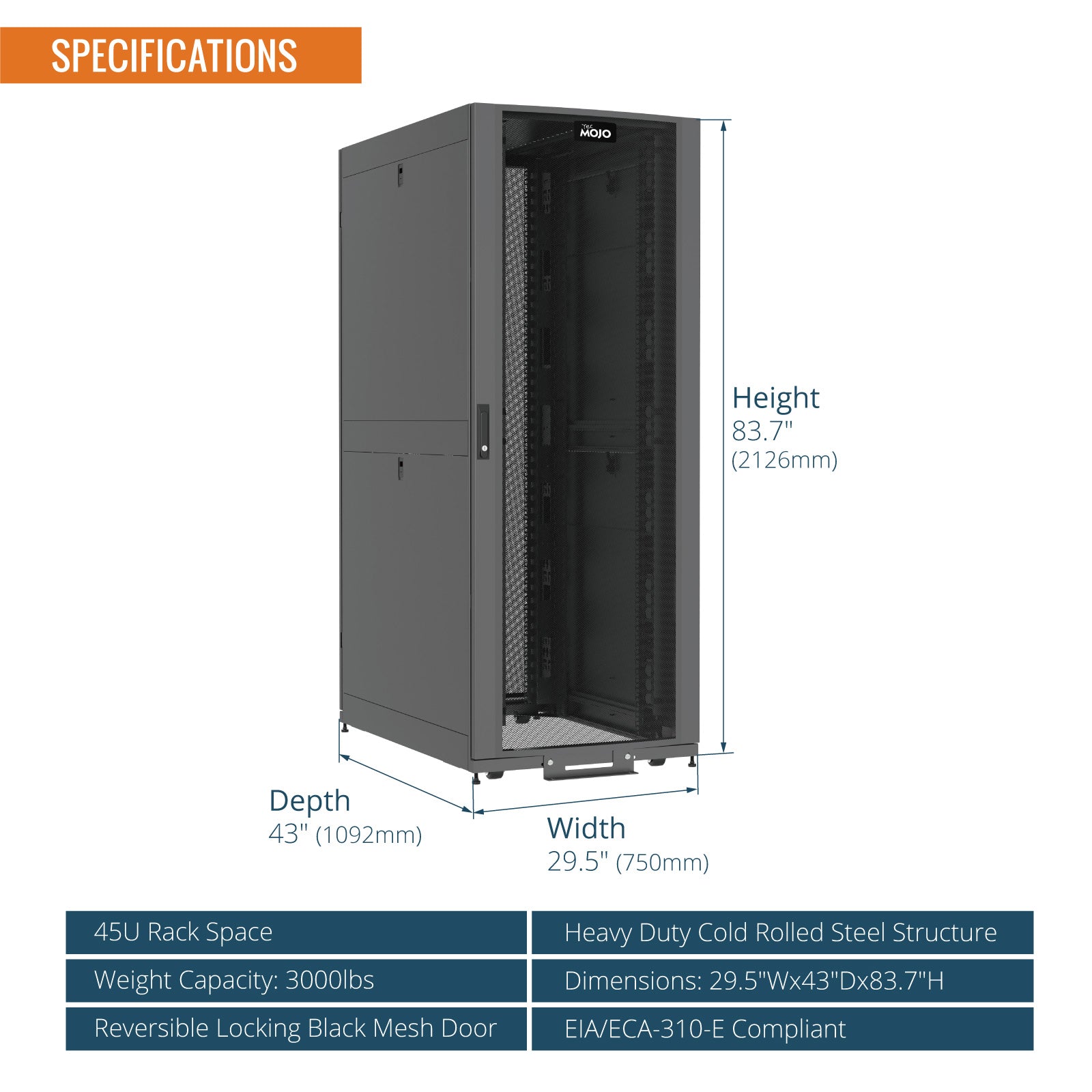 Tecmojo 45U Assembled 43 Inch Depth with Doors, 29.5 Inch Wide, Front Mesh/Back Split Mesh Door, Black Server Cabinet with Casters and Leveler - 3000 Lbs Weight Capacity