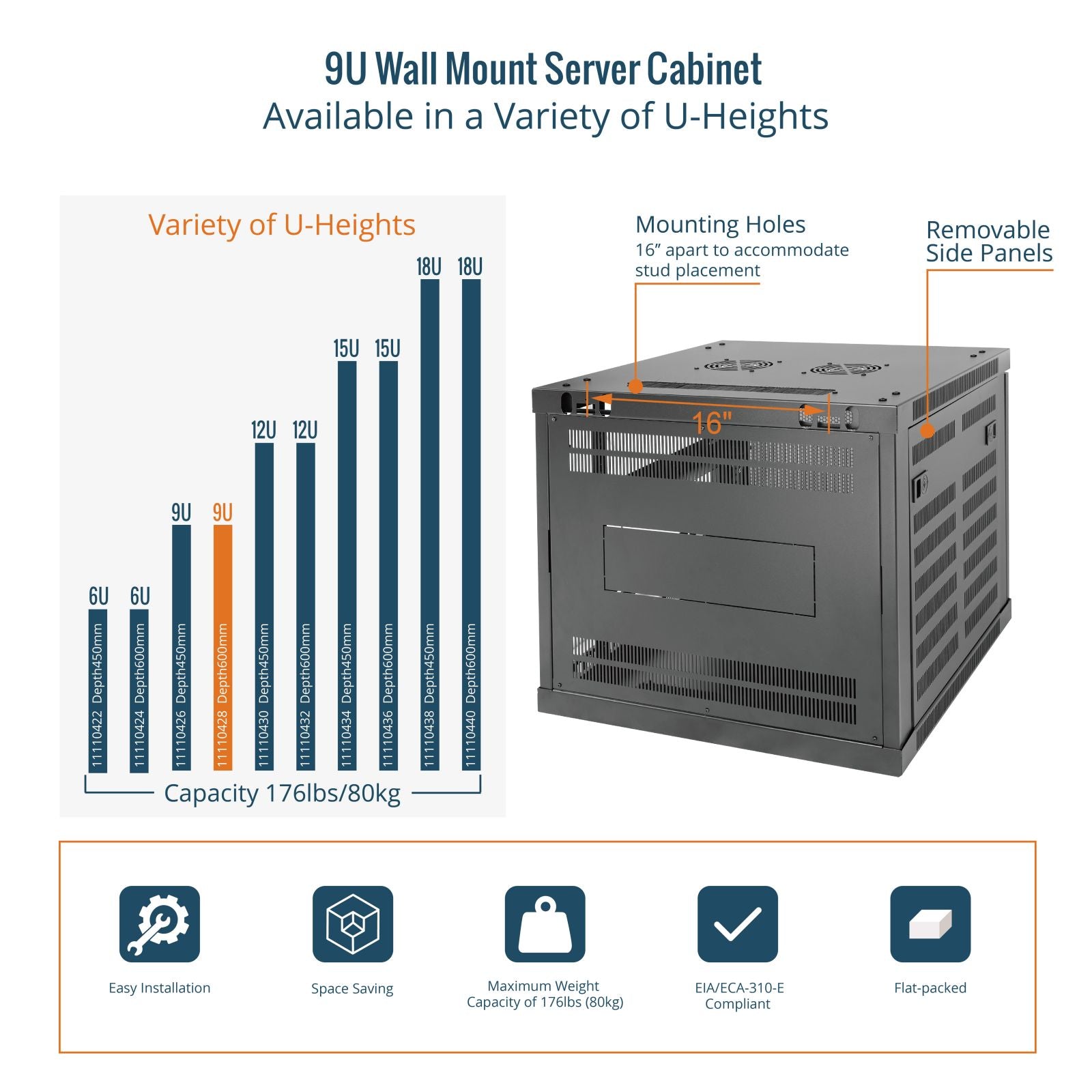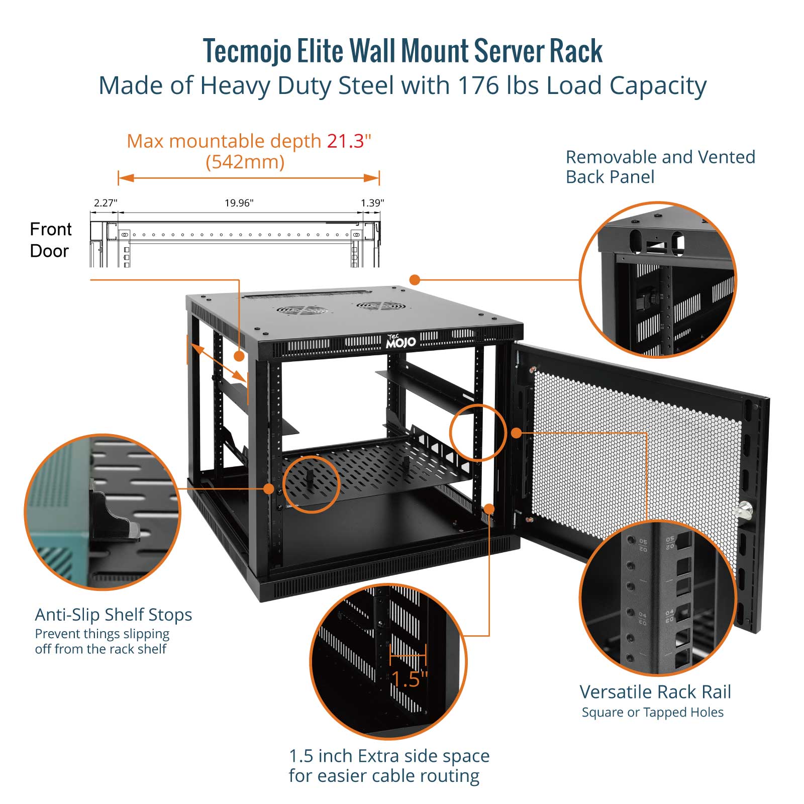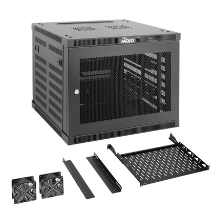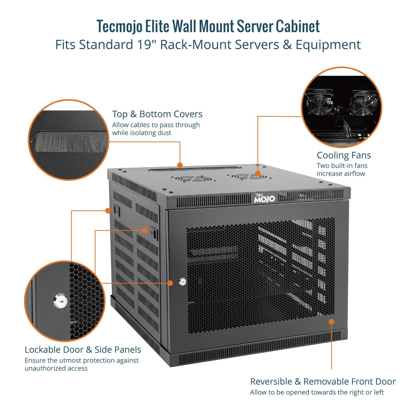 The Tecmojo Elite Series Network Cabinet offers a durable and efficient solution for IT and server equipment. Wall mount network cabinet is constructed from high-quality cold-rolled steel with a powder-coated finish,network cabinet wall mount supports up to 176 lbs when wall-mounted and 350 lbs when floor-mounted. Wall mount server cabinet is designed for standard 19" rack equipment, it allows for both freestanding and wall-mounted setups. Extra space on each side improves cable access and management, while dual top-mounted fans ensure optimal ventilation. Lockable front and side panels provide security, and a fully removable back panel simplifies installation and maintenance. Included accessories, such as a 1U cantilever shelf and L-shaped brackets, maximize storage versatility and perfect for space-constrained settings. Available in 6U, 9U, 12U, 15U and 18U with various of depth.