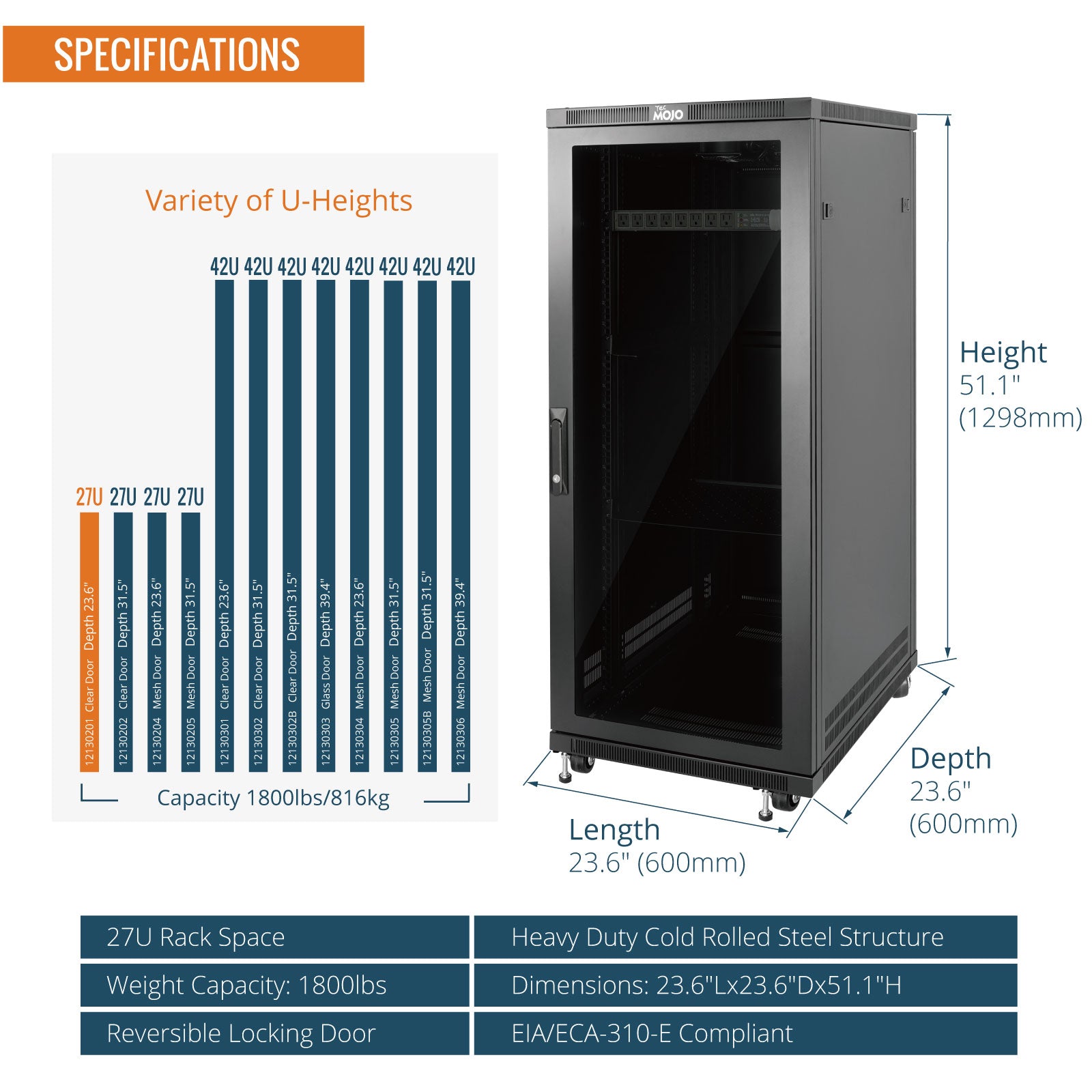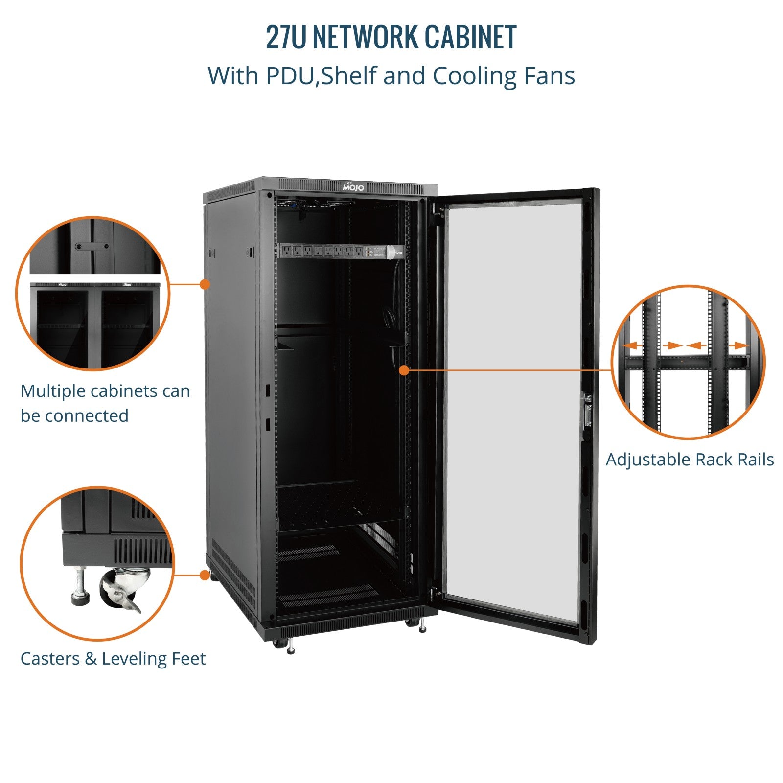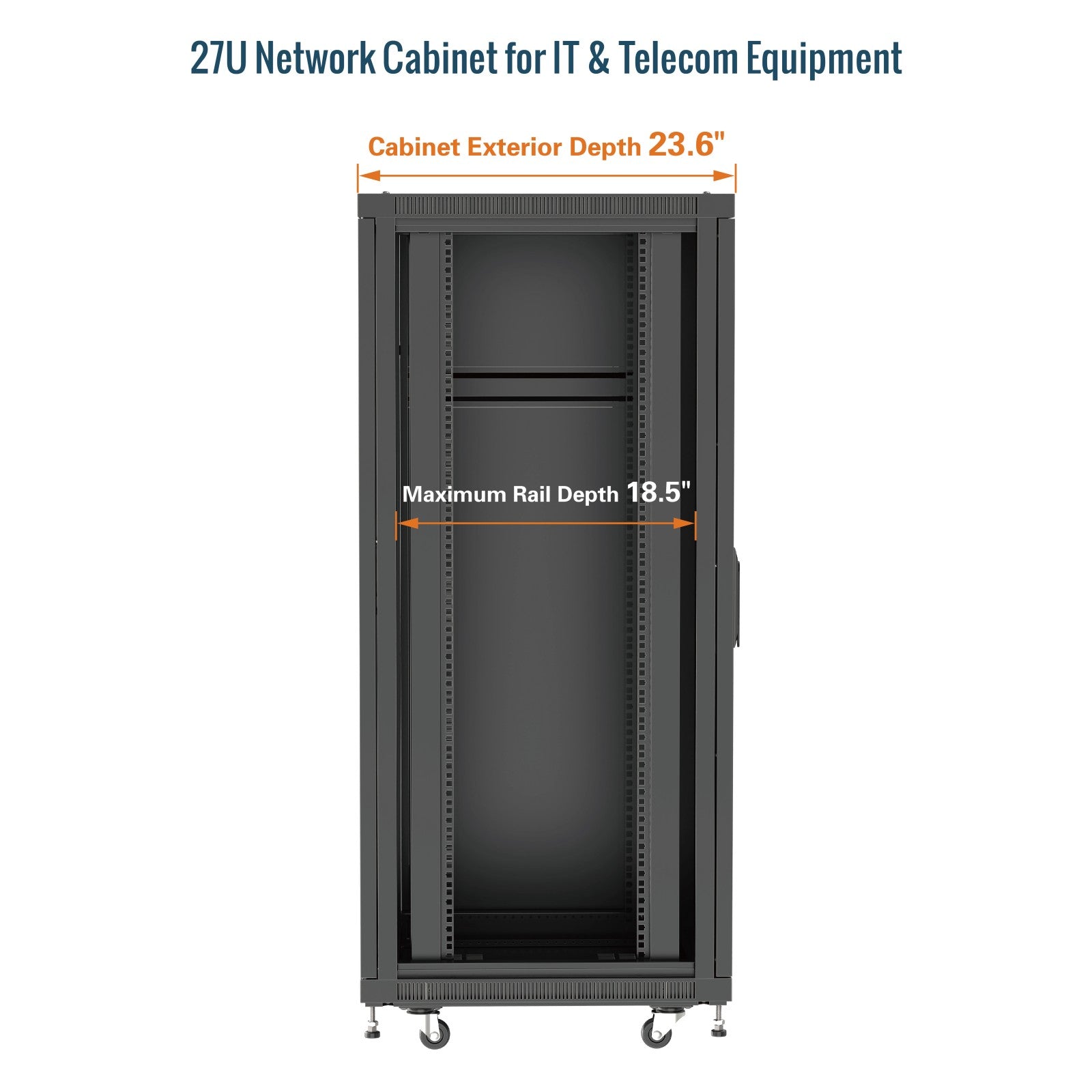 Tecmojo 27U 23.6 Inch Depth Glass Door Server Cabinet with Casters-1800lbs Weight Capacity