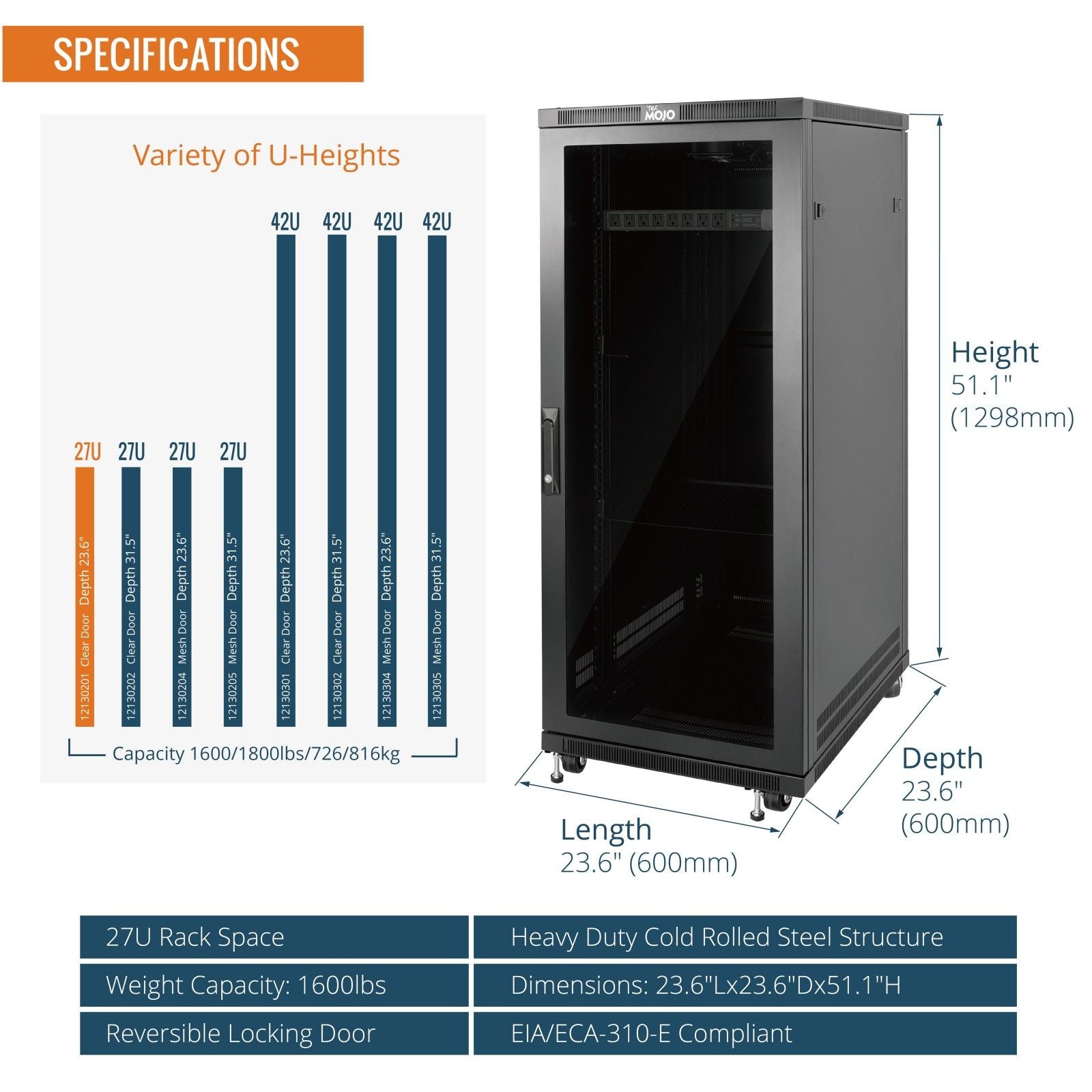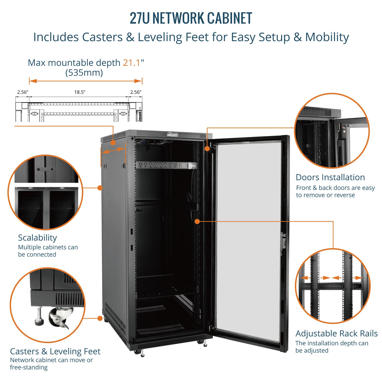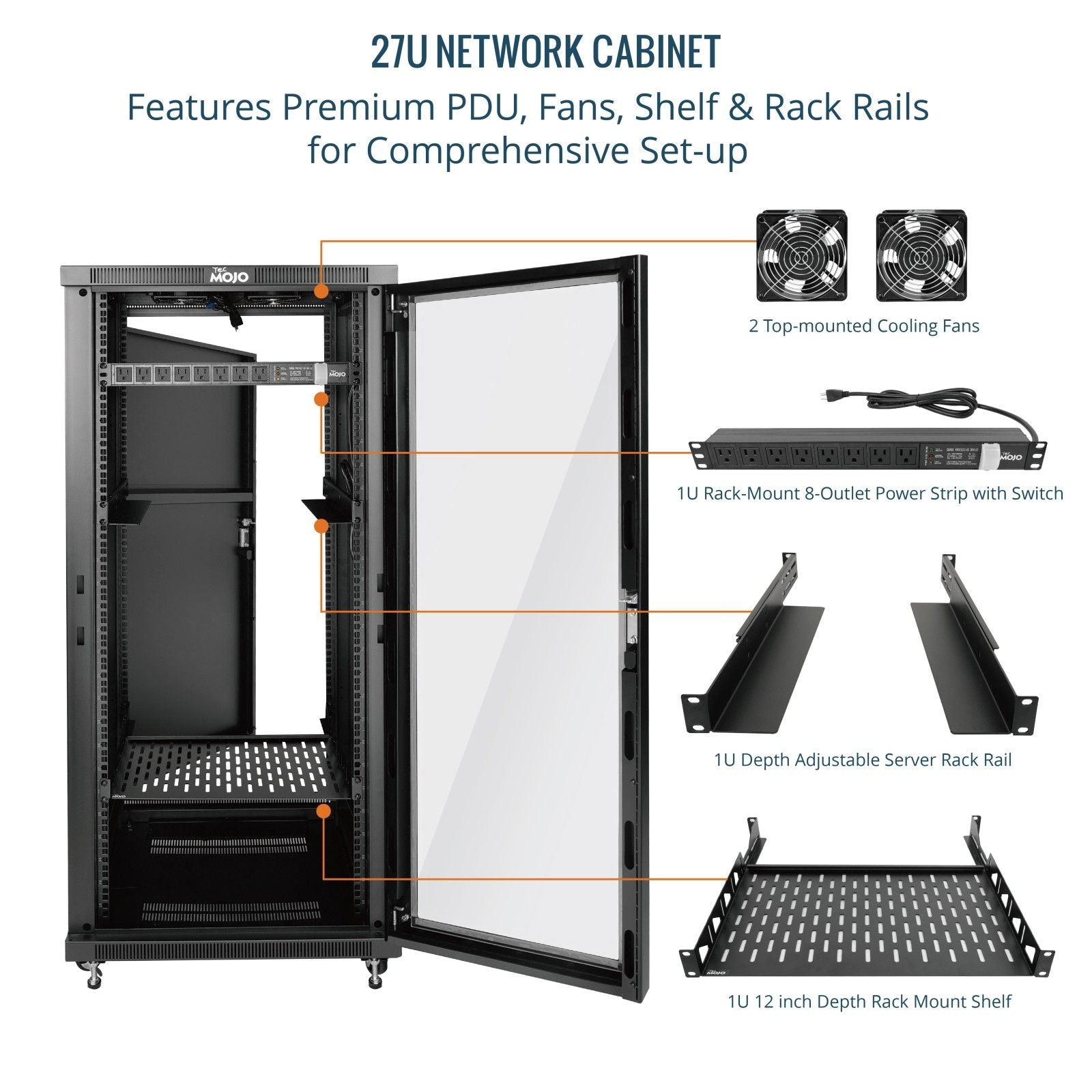 Tecmojo 27U 23.6 Inch Depth Glass Door Server Cabinet with Casters-1600lbs Weight Capacity
