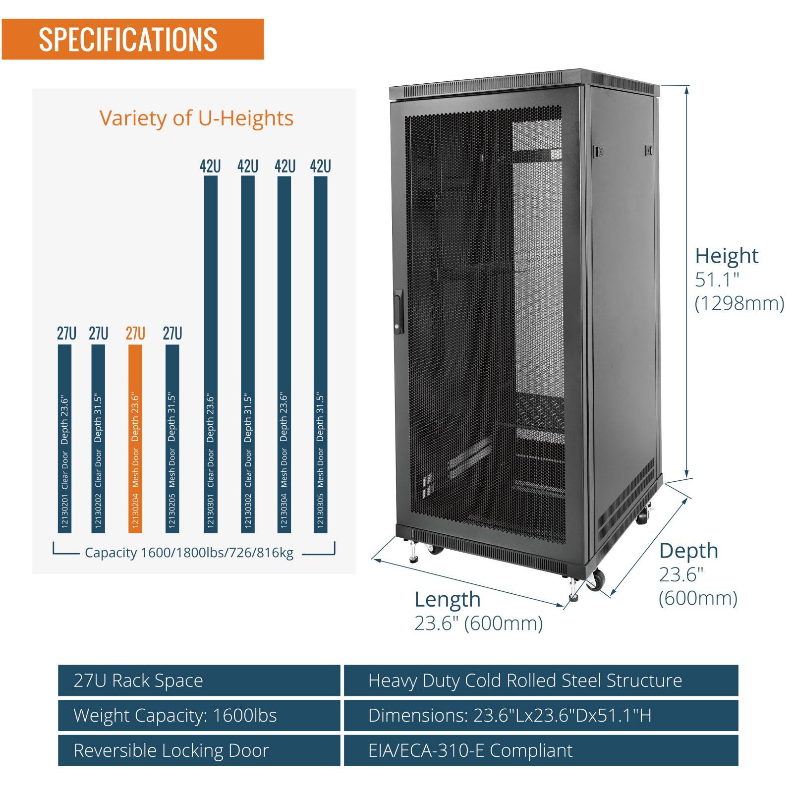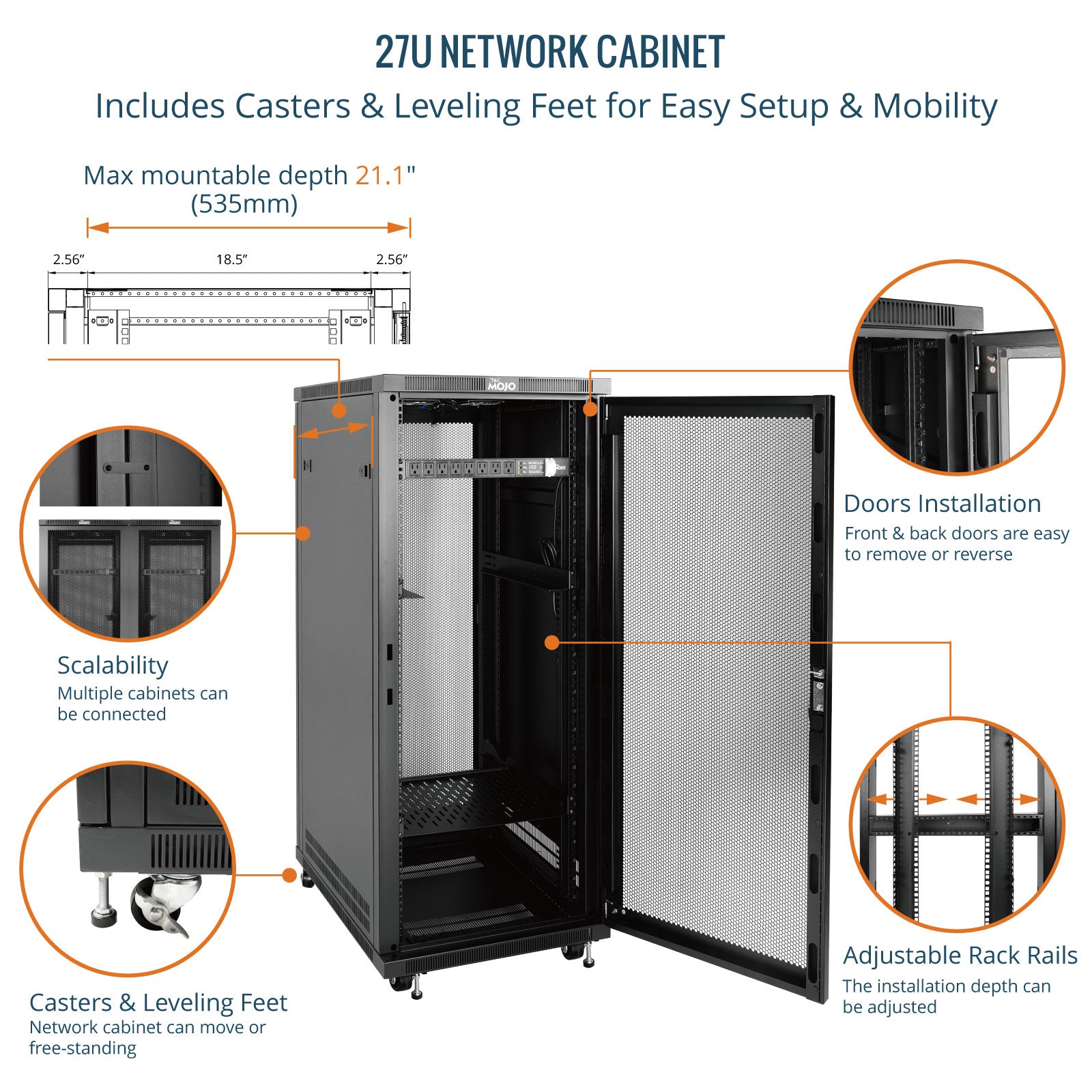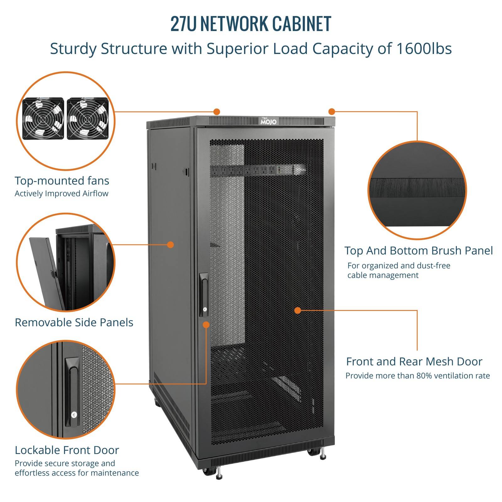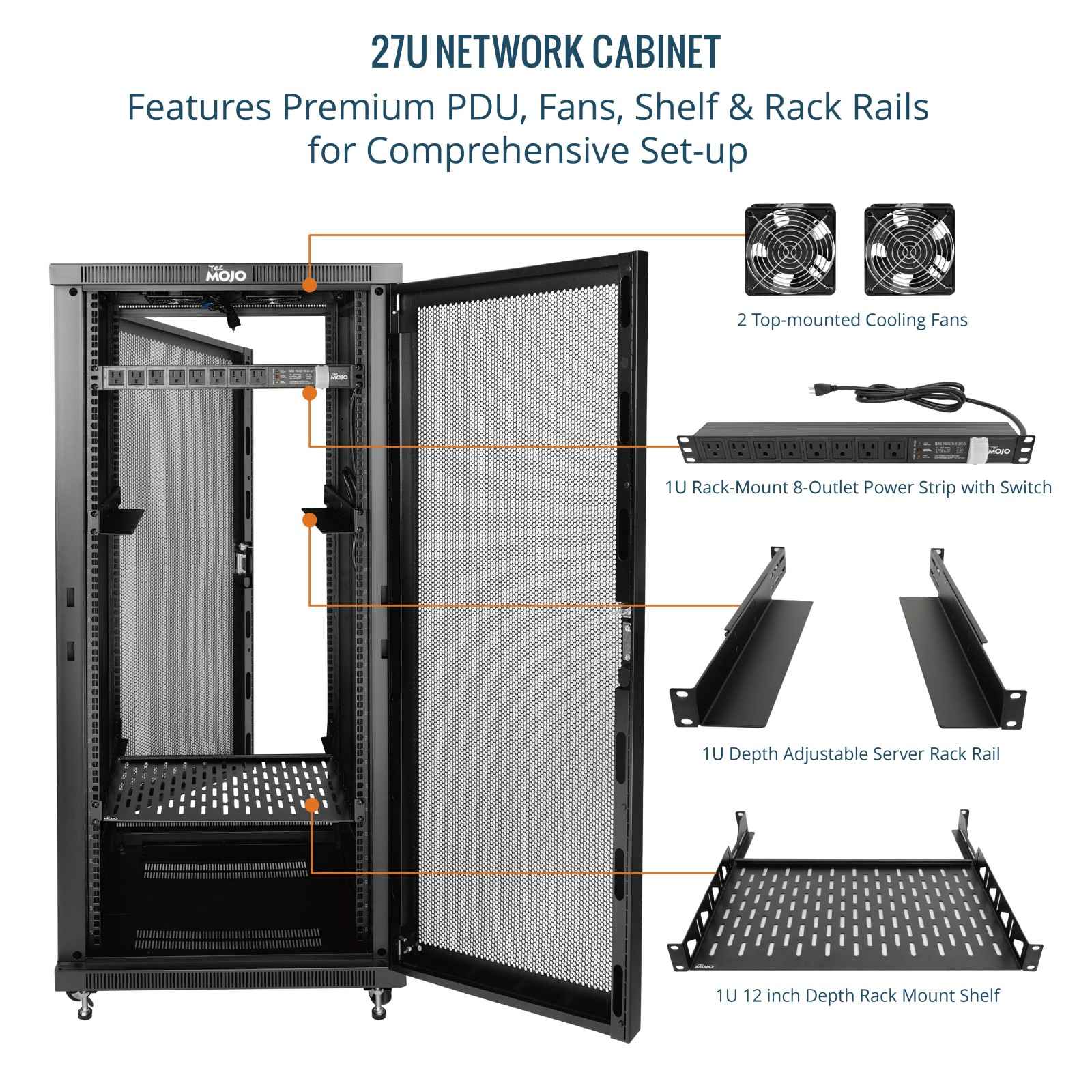 Tecmojo 27U 23.6 Inch Depth Mesh Door Server Cabinet with Casters-1600lbs Weight Capacity