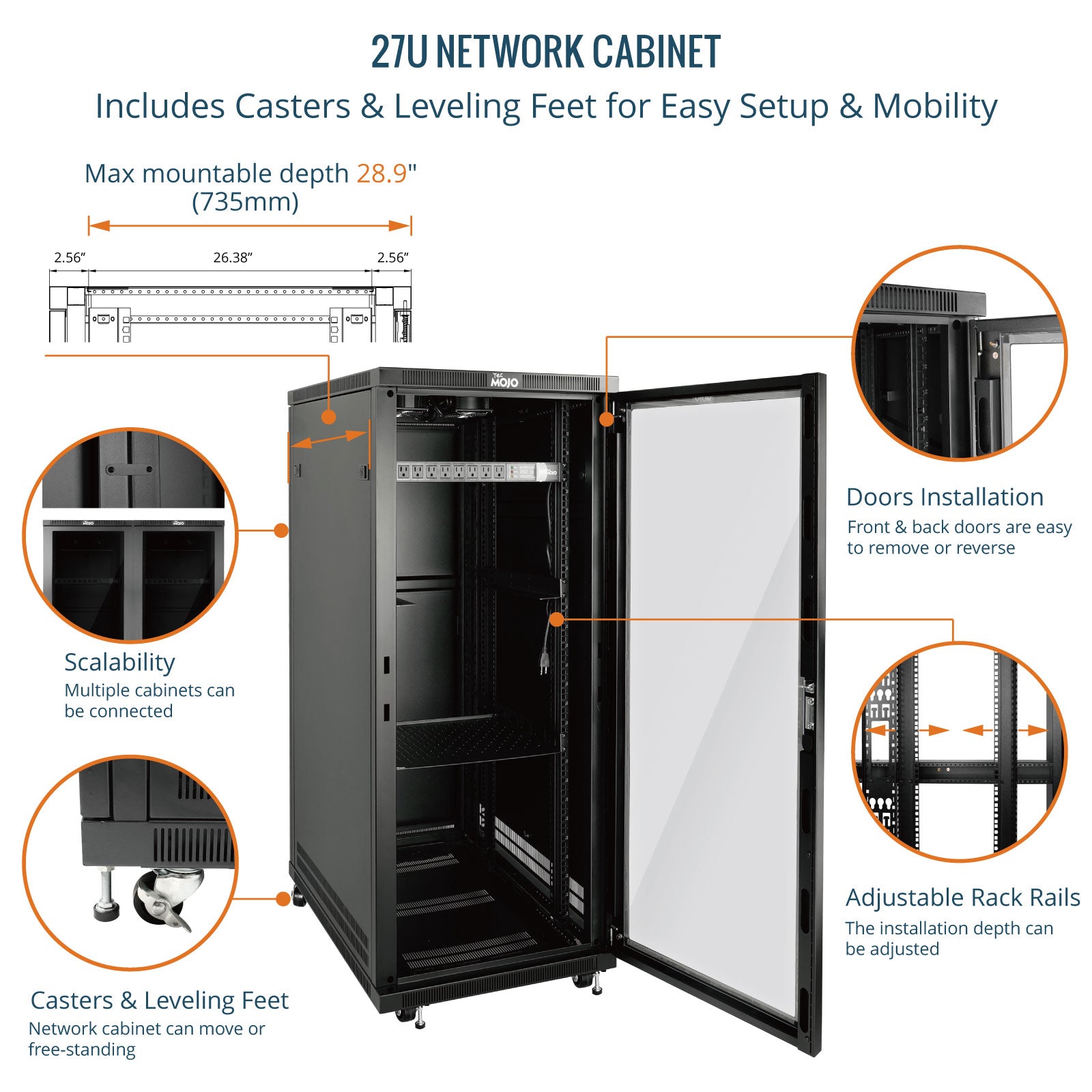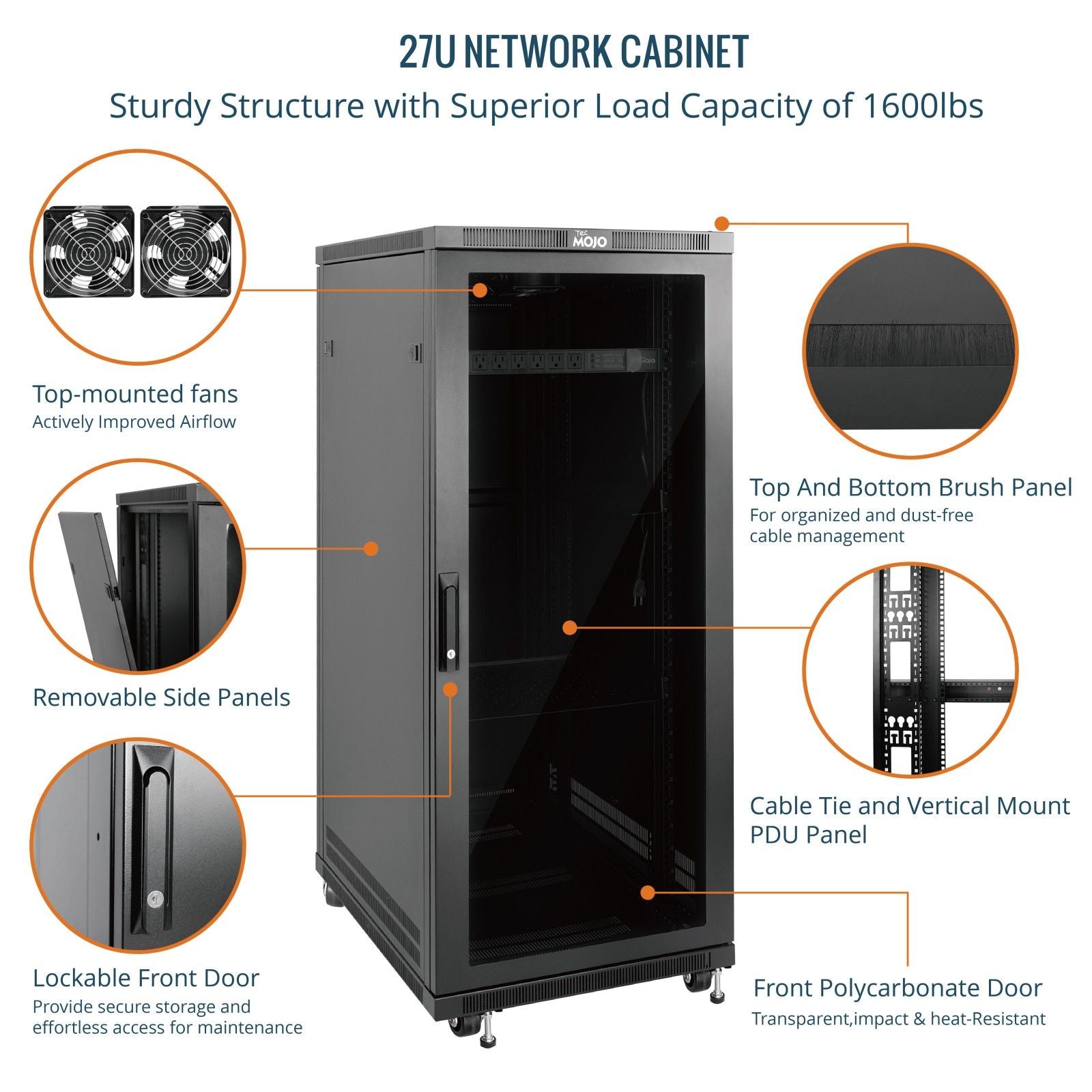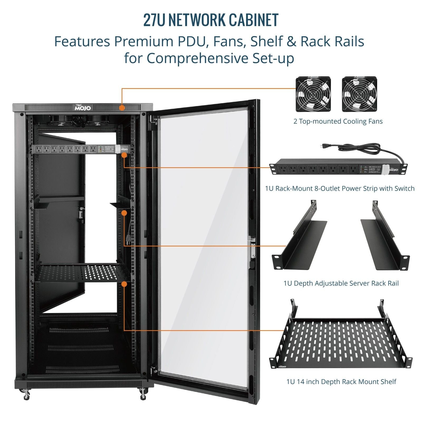Tecmojo 27U 31.5 Inch Depth Glass Door Server Cabinet with Casters-1600lbs Weight Capacity