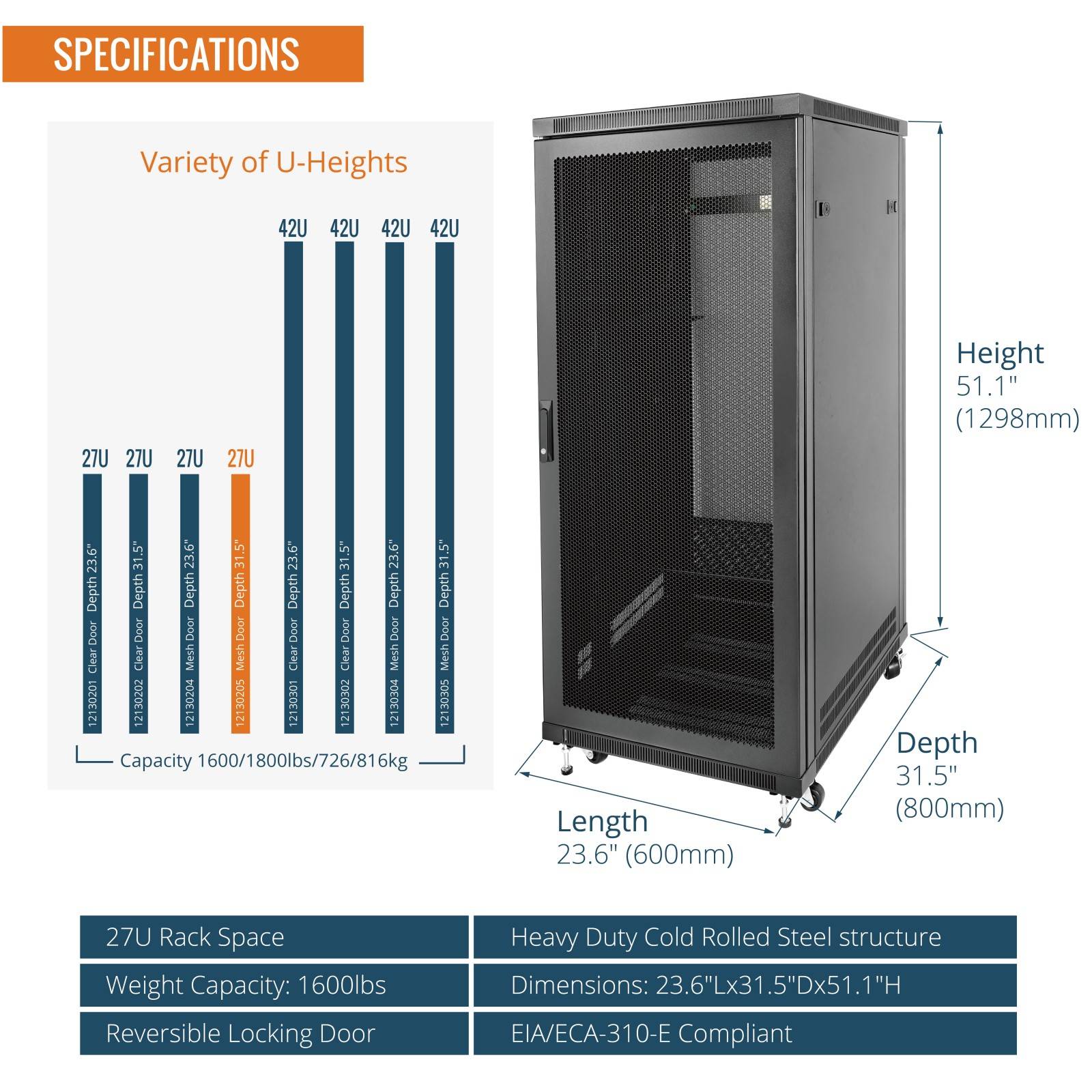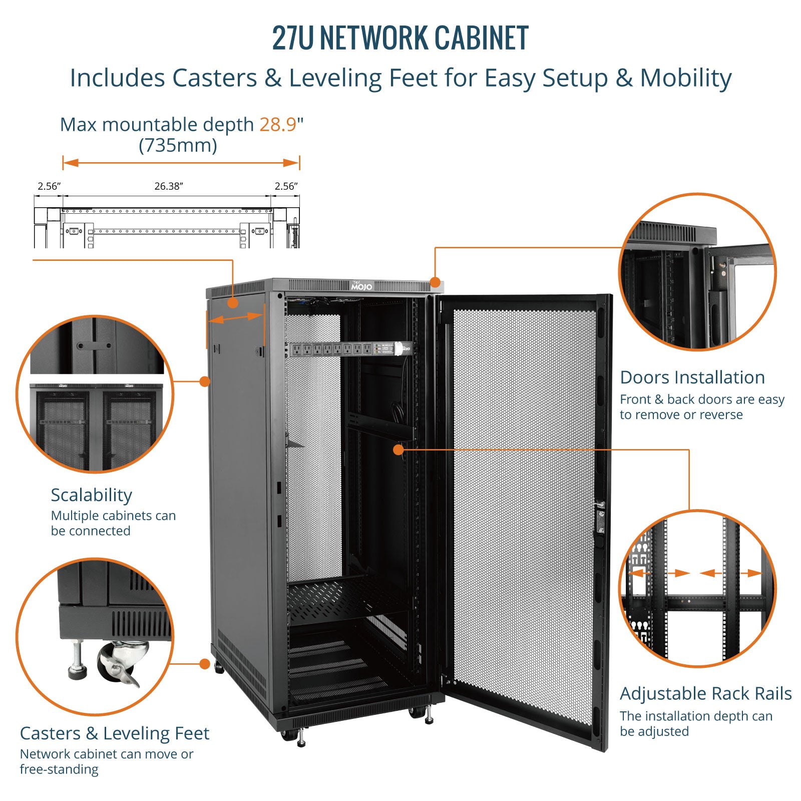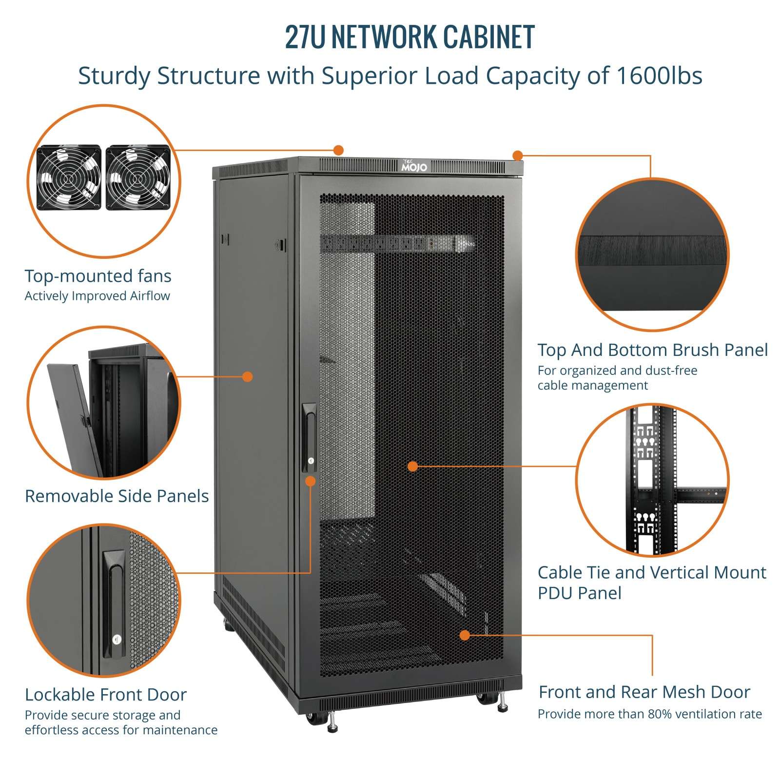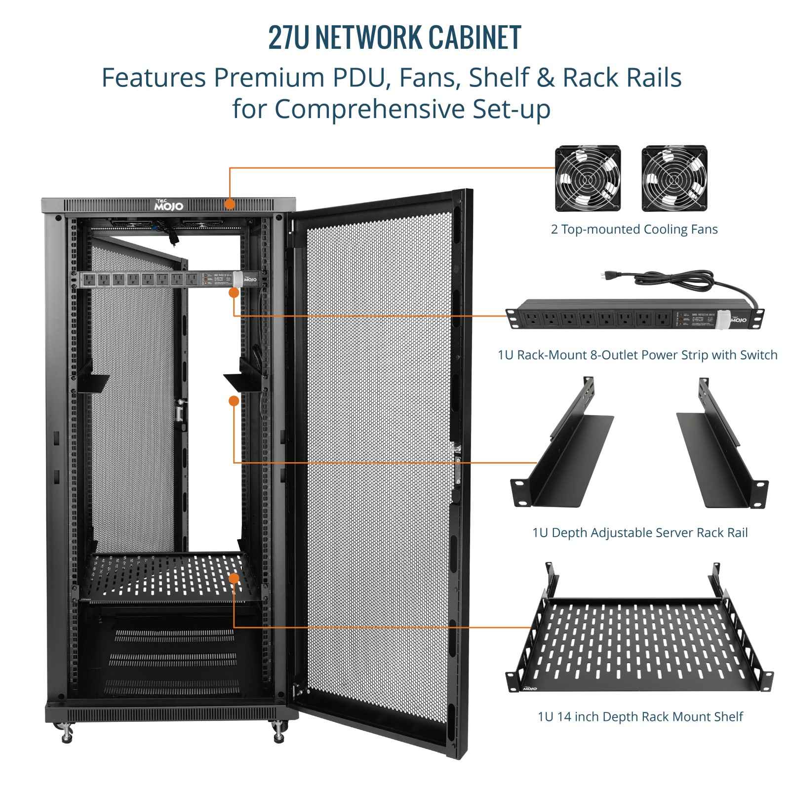 Tecmojo 27U 31.5 Inch Depth Mesh Door Server Cabinet with Casters-1600lbs Weight Capacity
